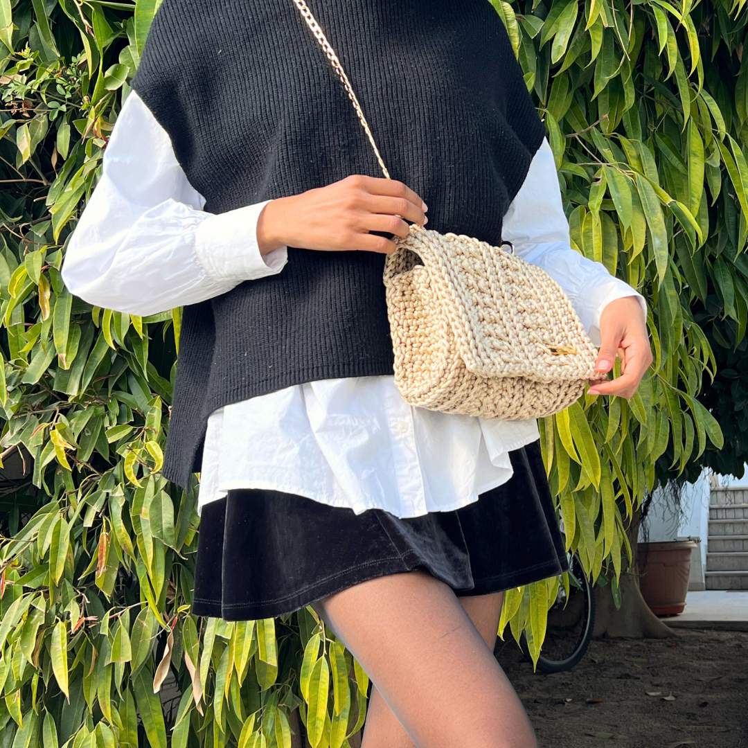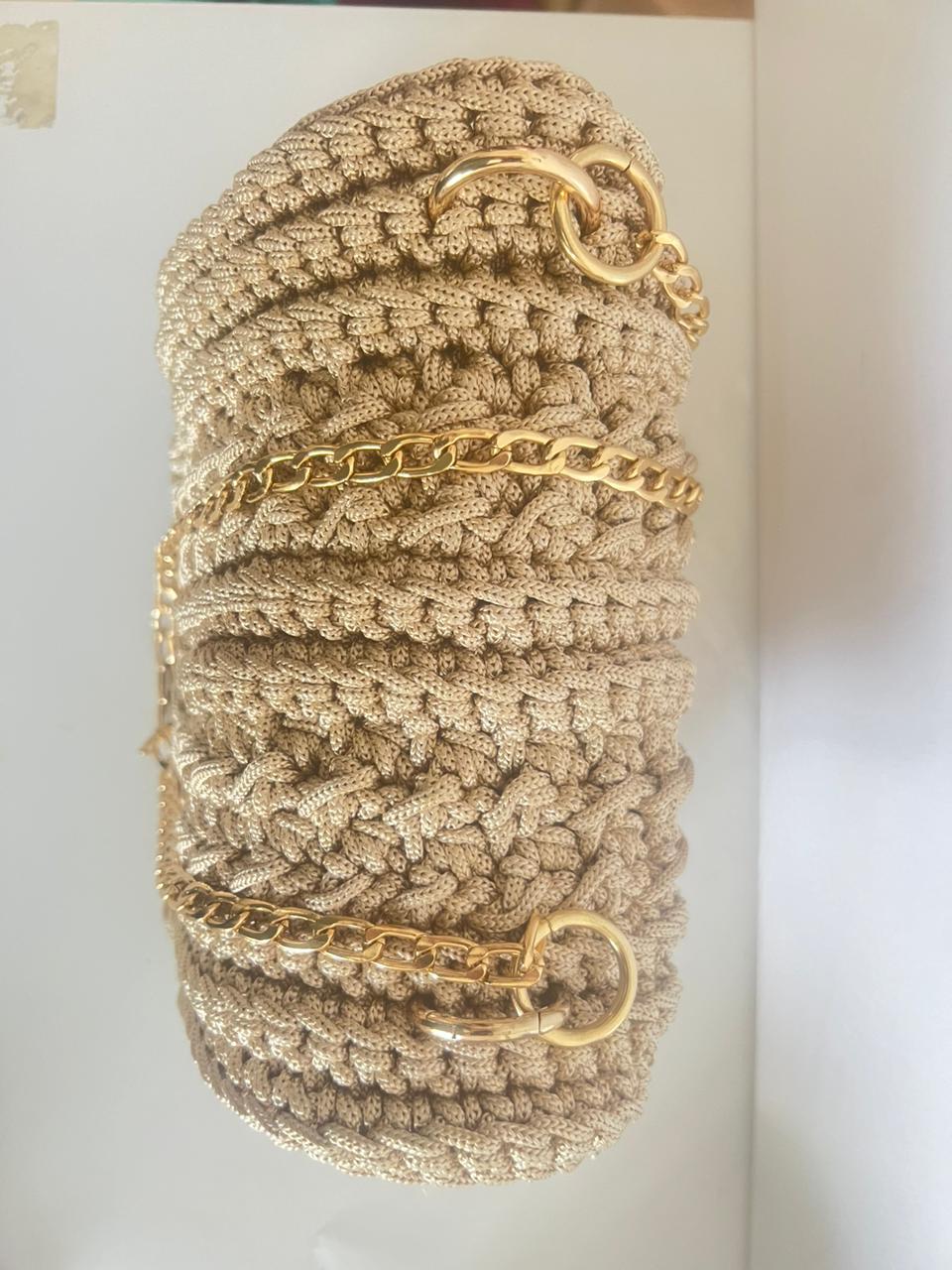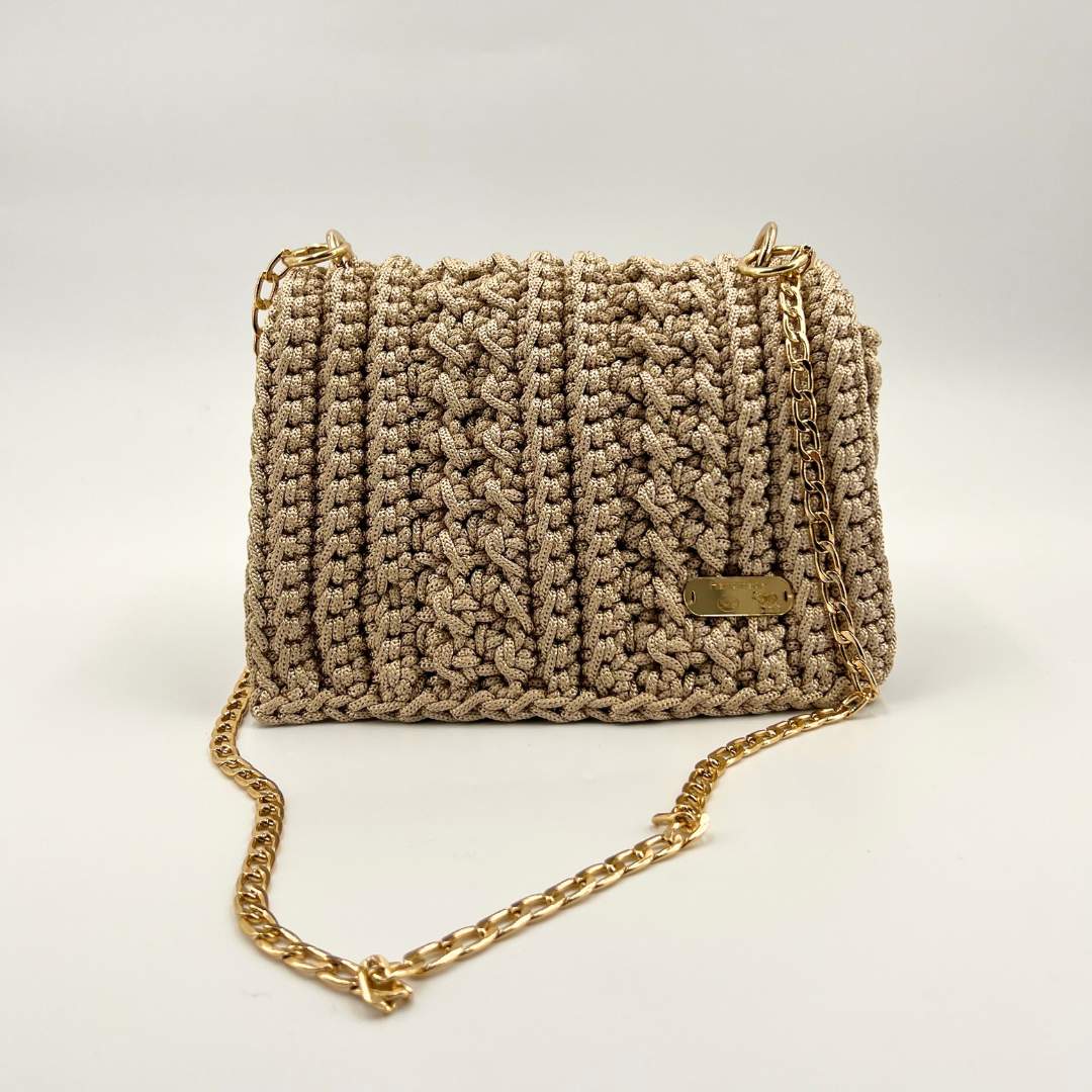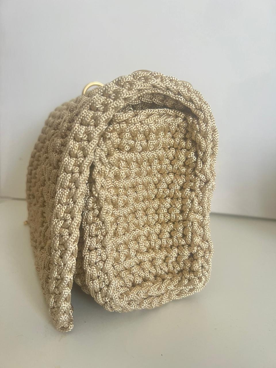 Nom : sac à main beige en crochet macramé